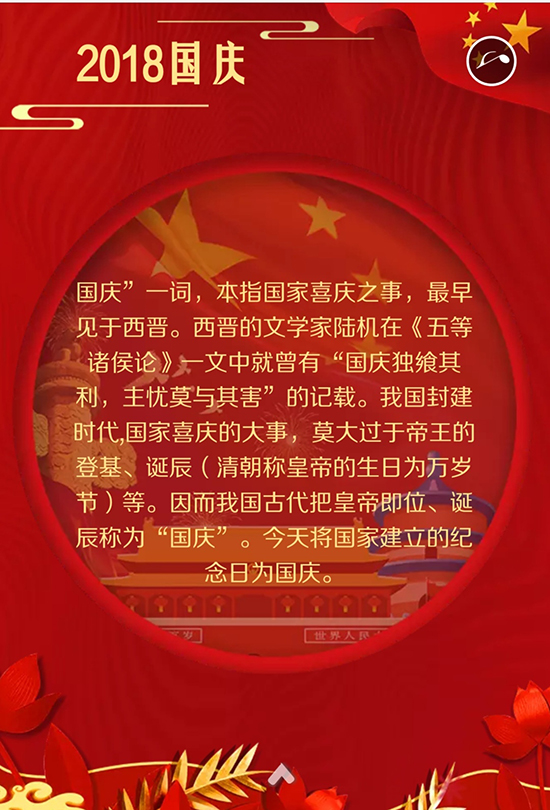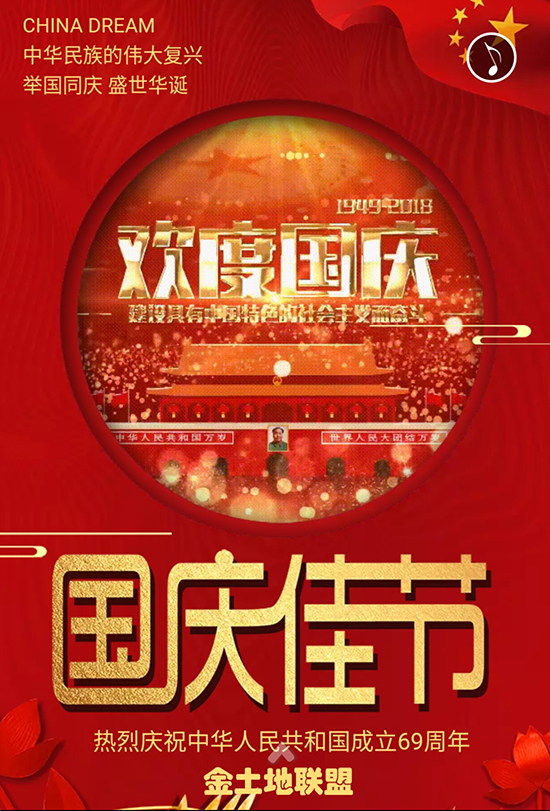 金土地联盟-举国同庆,盛世华诞! 责任编辑:金土地联盟 来源:www.nbjtd.com 2021-12-30 432 字号: 分享 热烈庆祝中华人民共和国成立69周年-金土地联盟全体成员 “国庆”一词,本指国家喜庆之事,最早见于西晋。西晋的文学家陆机在《五等诸侯论》一文中就曾有“国庆独飨其利,主忧莫与其害”的记载、 我国封建时代、国家喜庆的大事,莫大过于帝王的登基、诞辰(清朝称皇帝的生日为万岁节)等。因而我国古代把皇帝即位、诞辰称为“国庆”。 今天称国家建立的纪念日为国庆。 在我国,国庆节特指中华人民共和国正式宣告成立的10月1日。 阅读原文 上一条 宁波总公司召开的“金土地联盟2019年年中工作总结会”圆满落幕 下一条 热烈祝贺 金土地联盟新成员“合肥奥力德”隆重开业!!!